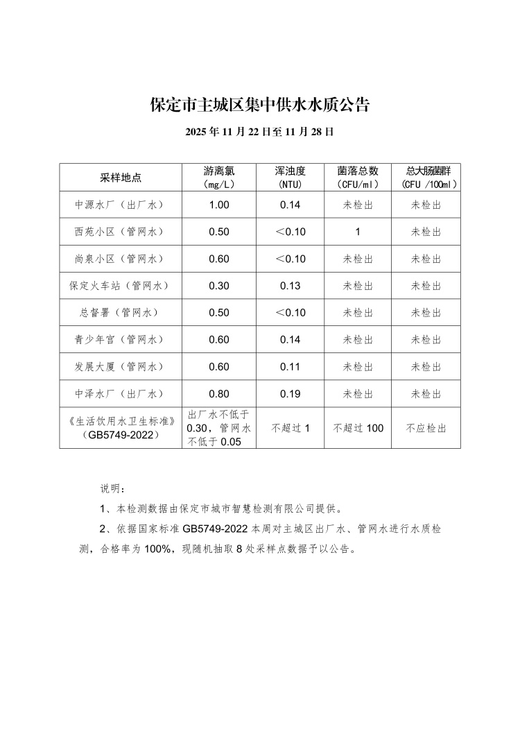 主城區(qū)集中供水水質(zhì)公告(11月22日至11月28日)