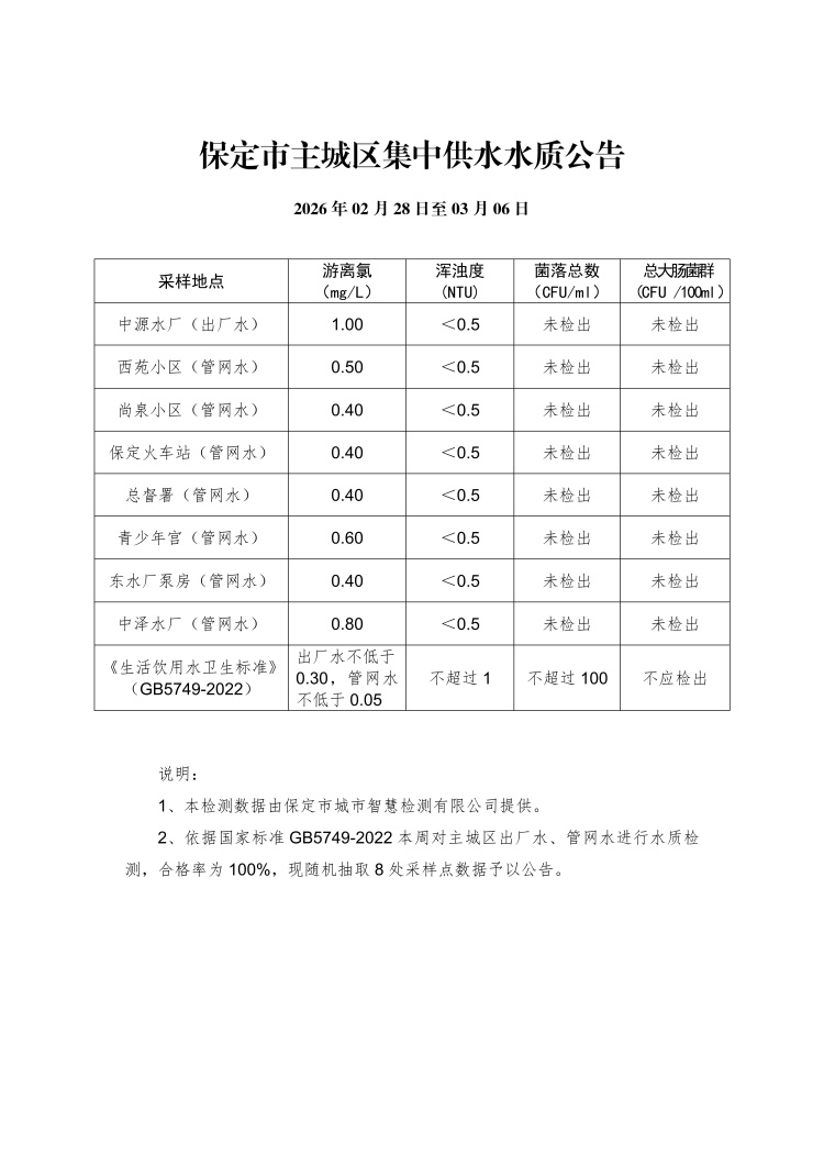 主城區(qū)集中供水水質(zhì)公告(02月28日至03月06日)
